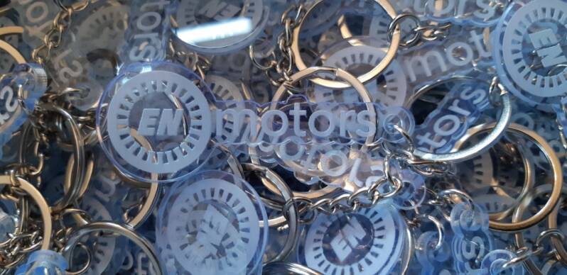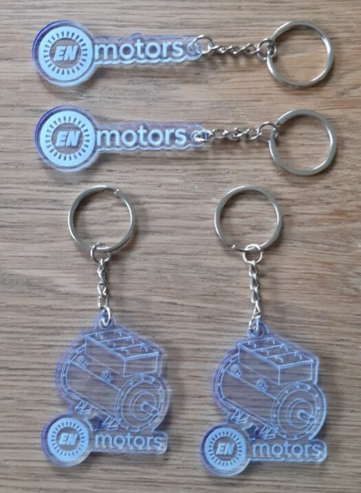 Voor Elektromotoren Nijmegen hebben wij twee verschillende sleutelhangers ontworpen met hun logo.