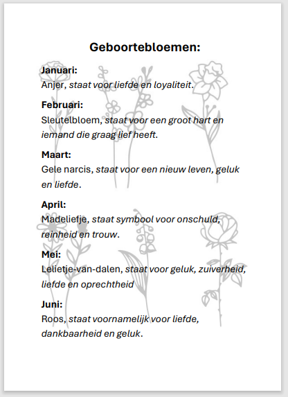 De geboortebloem wordt geleverd met kaartje waarop de betekenis van de bloemen staan.